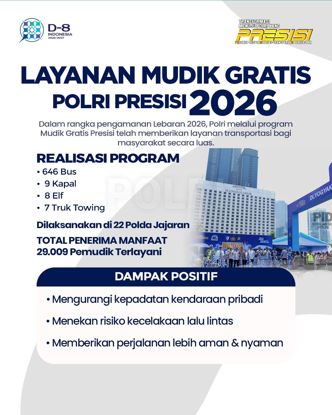 Program Mudik Gratis Polri Presisi 2026 menjadi bentuk nyata pelayanan Polri dalam mendukung perjalanan masyarakat saat Lebaran. Berdasarkan hasil anev, sebanyak 29.009 pemudik telah terlayani melalui penyediaan ratusan moda transportasi di 22 Polda jajaran. Upaya ini diharapkan mampu menciptakan perjalanan yang lebih aman, nyaman, dan lancar. Mudik Aman, Keluarga Bahagia.