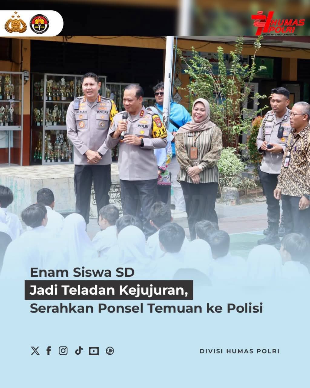 Polri melalui Polda Metro Jaya memberikan apresiasi kepada enam siswa SDN Setu 02 Cipayung, Jakarta Timur, yang menunjukkan sikap jujur dengan menyerahkan ponsel temuan ke kantor polisi. Aksi terpuji ini mendapat perhatian langsung dari Kapolda Metro Jaya Irjen Pol. Asep Edi Suheri, S.I.K., M.Si., yang datang ke sekolah untuk memberikan penghargaan. Dalam kunjungannya, Kapolda Metro Jaya menyematkan Pin Penjaga Jakarta sebagai bentuk apresiasi atas kejujuran para siswa. Polri berharap, semangat kejujuran dan tanggung jawab ini dapat menjadi inspirasi bagi generasi muda di seluruh Indonesia.