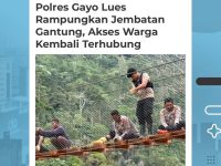 Polres Gayo Lues bersama Polsek Putri Betung dan warga setempat menyelesaikan pembangunan jembatan gantung di Dusun Begade Empat, Desa Ramung Musara, Kecamatan Putri Betung, Sabtu (7/2). Pembangunan yang rampung pada hari ke-5 ini bertujuan mempermudah akses dan mobilitas warga, khususnya menuju area perkebunan. Jembatan dinyatakan layak dan siap digunakan setelah melalui pengecekan kekuatan konstruksi, sebagai wujud kepedulian Polri dalam membantu pemulihan infrastruktur desa pascabencana serta memperkuat sinergi dengan masyarakat. “Keterlibatan langsung personel Polri bersama masyarakat menunjukkan sinergi yang baik dan diharapkan dapat semakin meningkatkan kepercayaan masyarakat terhadap Polri,” ucap Kabid Humas Polda Aceh Kombes Pol. Joko Krisdiyanto, S.I.K.