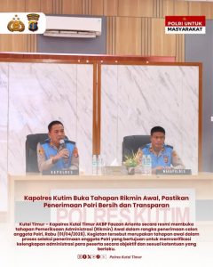 KUTAI TIMUR – Kapolres Kutai Timur AKBP Fauzan Arianto membuka secara resmi tahapan Pemeriksaan Administrasi (Rikmin) Awal untuk penerimaan calon anggota Polri, Rabu (01/04/2026). Kegiatan ini menjadi langkah awal verifikasi kelengkapan administrasi peserta secara objektif dan sesuai ketentuan.