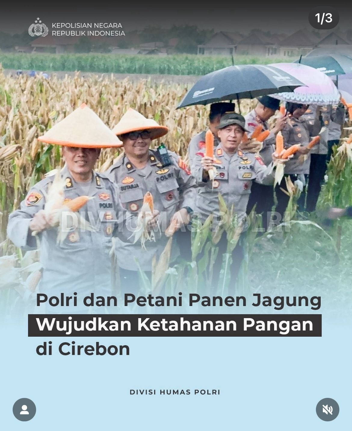 Cirebon menggelar kegiatan panen jagung di Desa Beringin, Kecamatan Pangenan, Kabupaten Cirebon sebagai bentuk dukungan terhadap program swasembada pangan nasional. Panen jagung dilakukan di lahan seluas 1 hektare, hasil kerja sama Polresta Cirebon, pemerintah desa, dan kelompok tani.