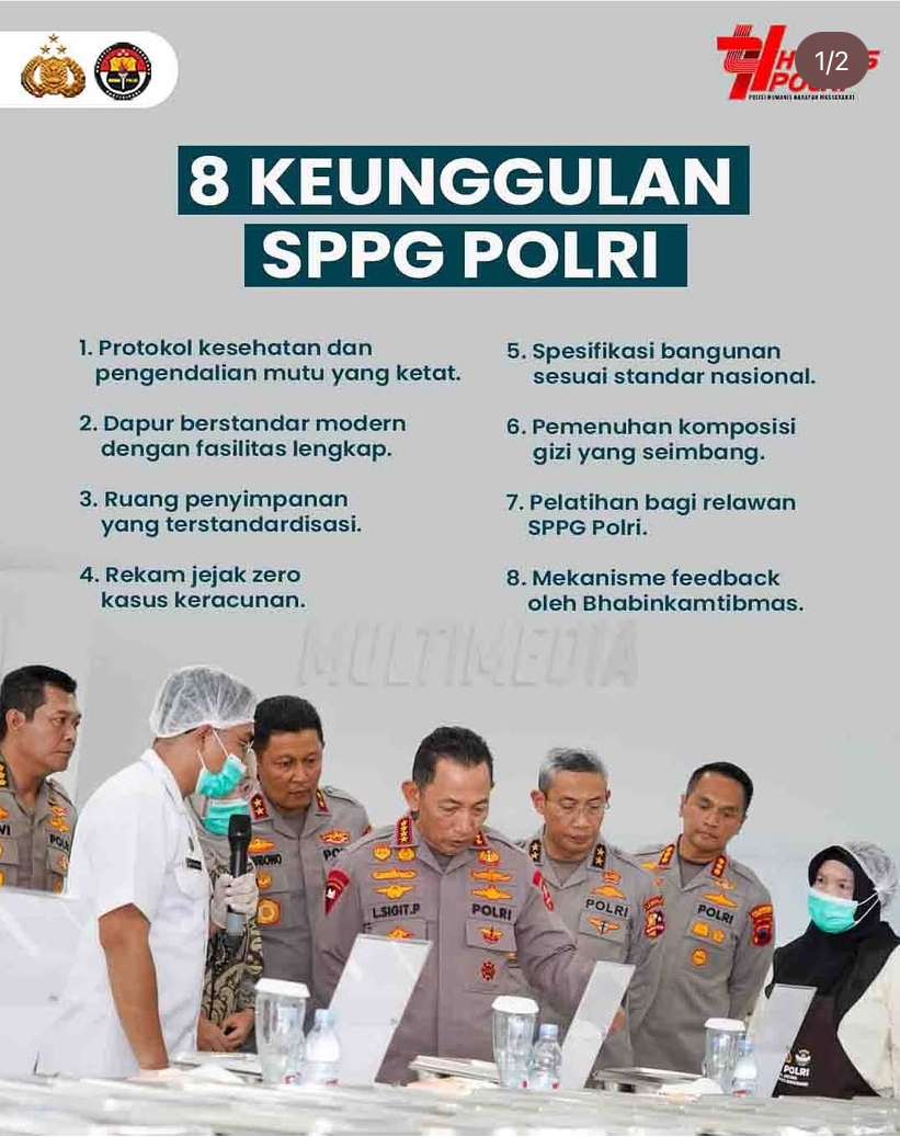 Dalam rangka mendukung program ketahanan pangan Polri mendirikan Satuan Pelayanan Pemenuhan Gizi (SPPG) untuk mendorong program Makan Bergizi Gratis (MBG). Polri di bawah komando Kapolri Jenderal Polisi Drs. Listyo Sigit Prabowo, M.Si., memastikan makanan dan minuman yang diproduksi SPPG Polri dalam kondisi baik melalui adanya uji laboratorium oleh tim Kedokteran dan Kesehatan (Dokkes) Polri.