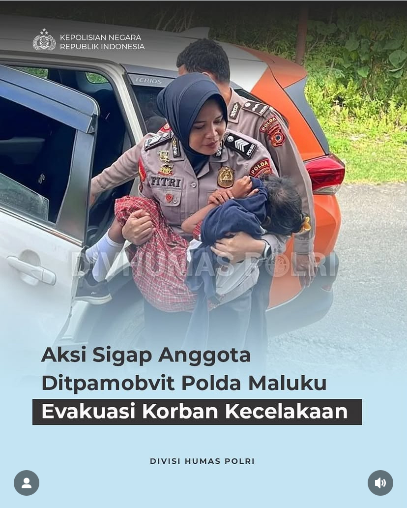 Polri melalui personel Ditpamobvit Polda Maluku mengevakuasi seorang anak sekolah dasar, Nadi Wangi (9 tahun) yang mengalami kecelakaan lalu lintas (lakalantas) di depan SD Negeri 201 Telaga Kodok, Kabupaten Maluku Tengah.